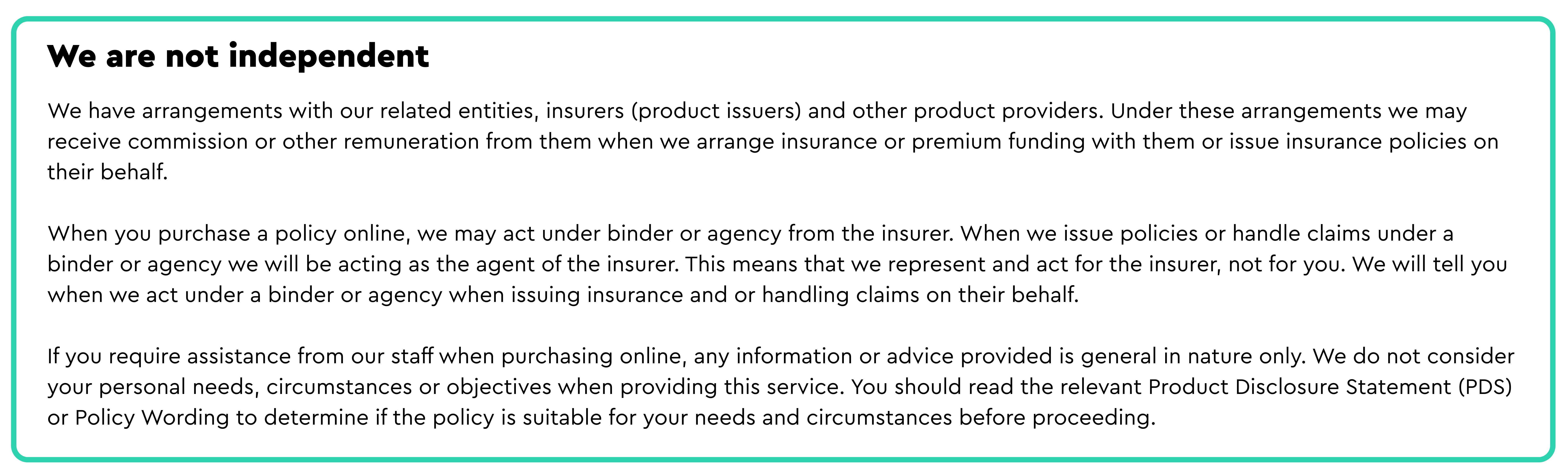 We also do not consider your personal objectives, financial situation or needs when providing this service. You should read the relevant Product Disclosure Statement (PDS) or Policy Wording to determine if the policy is suitable for your personal objectives, financial situation and needs before proceeding. We act on your behalf when arranging this insurance and handling any claims unless we tell you otherwise.